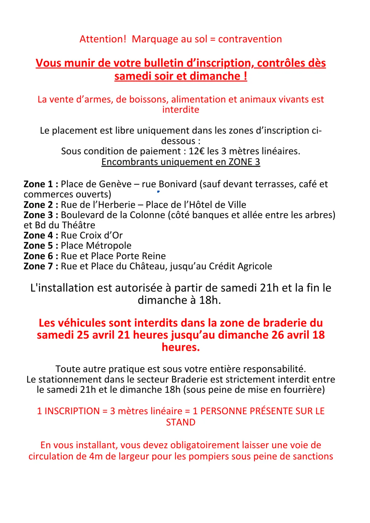 L’accès et le stationnement dans le secteur Braderie, est strictement interdit entre le samedi 21h et le dimanche 18h (sous peine de mise en fourrière).